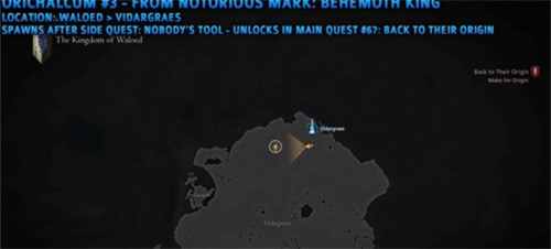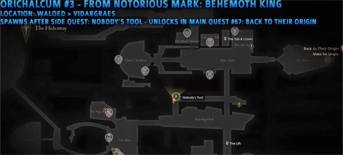 奥利哈康位置3:由恶名精英【帝王贝希摩斯】掉落,位于沃鲁德-维达草原(在主线任务67始源期间完成系列支线后刷新)。下方第一张图片为任务初始位置,第二张图片为任务结束后怪物的位置。