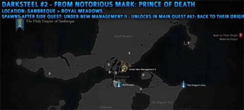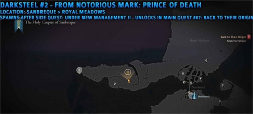 黑钢位置2:由恶名精英【死亡王子】掉落,位于桑布雷克皇家孪晶丘陵西侧草地(需要先完成主线任务67始源期间的支线任务后才会出现)。下方第一张图片为任务初始位置,第二张图片为任务结束后怪物的位置。