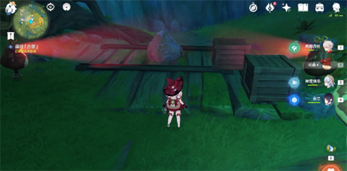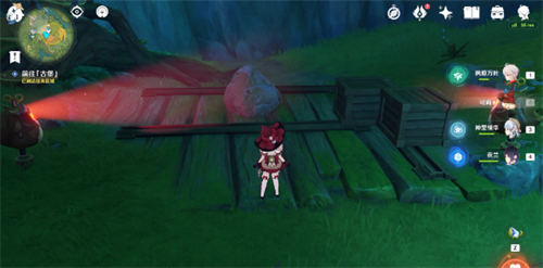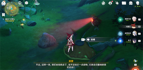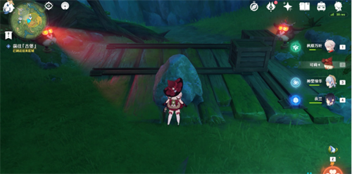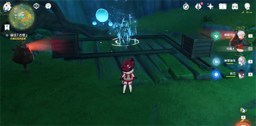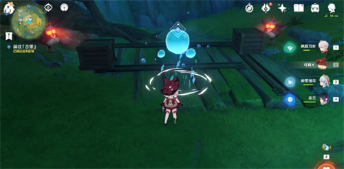 9、继续跟随水形幻灵移动,消除石壁后来到第四处幽魂机关,这里我们只需要往机关面前的碗中投喂2个树莓,就可以让机关的视线转向,解救水形幻灵(背包里没有树莓的旅行者,可以直接从旁边摘);
