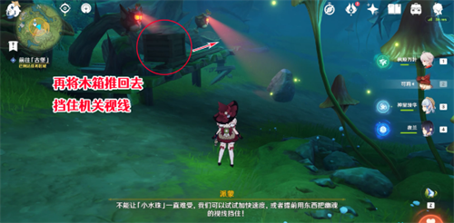 6、但当水形幻灵走到另一侧时,树干上又会再出现一个幽魂机关,继续使其石化,因此需要将刚才移动过来的木箱再移动回去,以挡住其视线;