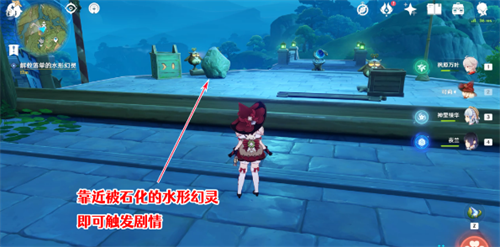 20、拿上药剂后,到已经变成石块的水形幻灵旁边即可触发剧情,提交刚才获得的药剂,即可将被石化的水形幻灵解救出来;