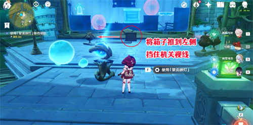 13、到达古堡高处的表演场地后,需要先将现实场景中的木箱推动至最左侧(需要多推几次),然后使用此处的「聚流映灯」,进入「先成图」中获取钥匙;