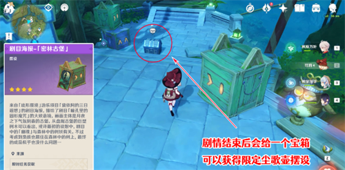 21、剧情结束后,三个剧集其中之一的「瞳孔里的固形魔咒」就全部完成了,任务结束后,演出场地旁边的阶梯下还会出现一个精致的宝箱,开启后可以获得限定尘歌壶摆设——剧目海报-「密林古堡」。