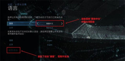 三、将语音调节为“繁体中文”,别忘了点击“接受语言”,否则不会生效。(默认的可能是非英语的其它语言,且没有自动下载语音包,所以导致问题出现)