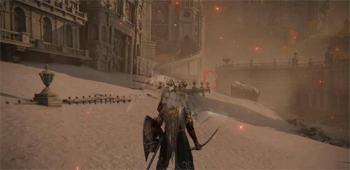 10、这里见过他们之后就可以放心烧树了,在打败风暴城最终boss黑剑之后,王城会变为灰城,在这里就可以再次见到柯林,从标记的路口前进过桥,然后左转走一段就可以看到金面具和他的大卢恩了。