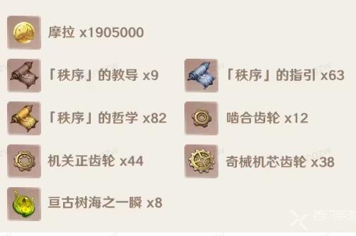 8→9:【秩序】的哲学*12、奇械机芯齿轮*9、亘古树海之一瞬*2、450000摩拉