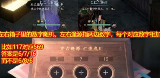 4、左右逢源提示指的是两边的数字,左右箱子里的数字是随机的,每个玩家都不一样,将每个对应的数字相加后即可得到答案,比如117对应569的话,答案就是6/7/16。