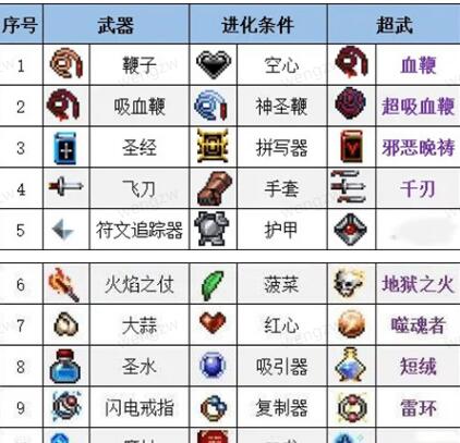 吸血鬼幸存者武器进化配方表是啥?吸血鬼幸存者里面可以得到的武器还是比较的多的,有些武器是能够进化的,武器进化的要求也不一样的,那么今天就给大家带来最新的武器进化配方表了呢。