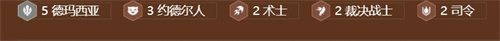羁绊:5德玛西亚,3约德尔,2术士,2裁决,2司令