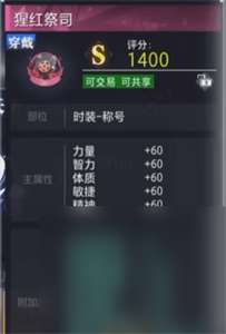 2、玩家在获得到这个称号时,也可以将它用来交易和共享操作,当然也不要小看它的属性能力,评分高达1400的s级别称号道具,从属性上比较合适输出职业类。