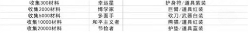 300材料幸运星,2000材料博学家,5000材料多面手,10000材料和平主义者,20000材料节俭者。