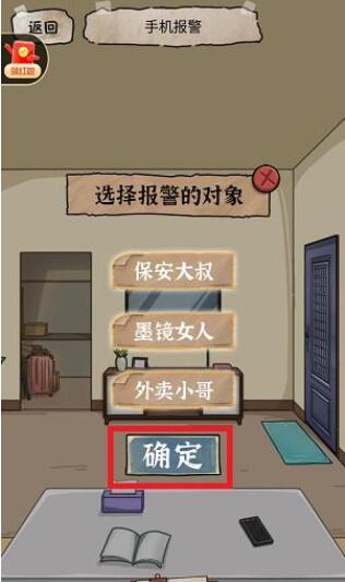 19、点击桌子上的手机,选择同时举报保安、女人、外卖小哥三人,点击“确定”;