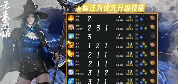 注:优先升级★标注的技能,直升之后的技能点数为261点,不足的技能点数可以通过后期获取之后再来升级。
