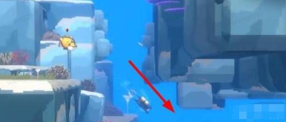 2、等到了一个石头缝隙位置,玩家要往右下方前进,一直朝下一直游;