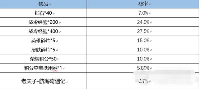 打开可随机获得以下奖励之一:老夫子-航海奇遇记、积分夺宝抵用券*1、英雄碎片*5、皮肤碎片*5、荣耀积分*50、200/400战令经验、钻石*40。
