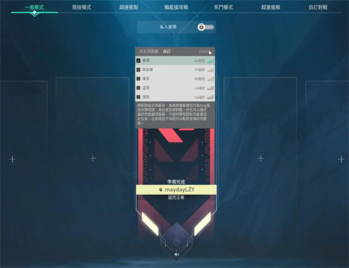 在我们开始游戏的界面中我们选择好想游玩的模式后在我们角色锦旗的右上方点击即可出现选择服务器的列表。只能在附近的大区进行选择,距离太远的大区不会互通。