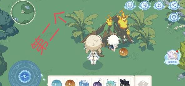 3、第二处:我们操纵旅行者来到这个地方后,用手拖动火史莱姆把旁边的木架子,烧掉后即可获得第二个海螺,点击海螺即可;