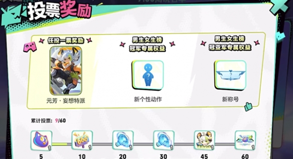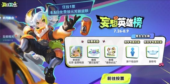 在活动期间累计投票到指定票数,即可领取对应的奖励,包含了新播报“夏日妄想、元芳新表情“使命必达”、限时语音“胜利只是囊中之物”和“兄弟们天下无敌”(使用后有效期14天)、新个性戳戳“多元漫游”、亲密度道具“为你打Call”;