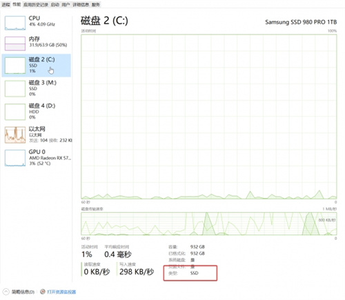 3 任务管理器中点击对应磁盘,查看磁盘类型描述。