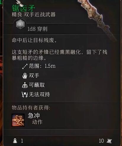 1、锯齿矛:1d8穿刺,双手近战短矛,命中后使敌人残废。