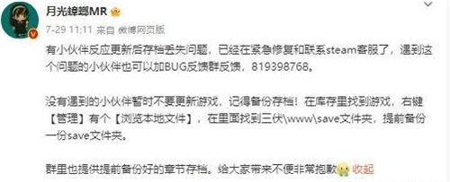 有小伙伴反应更新后存档丢失问题,已经在紧急修复和联系steam客服了,遇到这个问题的小伙伴也可以加BUG反馈群反馈,819398768。