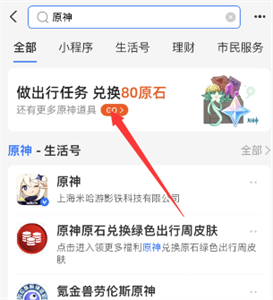 1、打开支付宝搜索《原神》,然后最上面地方位置就会有一个“做出行任务兑换80原石”;