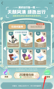 3、等攒够能量之后,点击下面的20里程兑换,第一个就是提纳里出行皮肤,之后还可以领取其他游戏奖励。