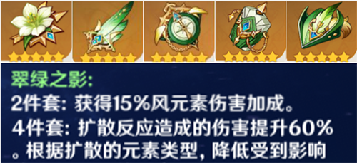 4件套效果:获得15%风元素伤害加成,扩散反应造成的伤害提升60%,根据扩散的元素类型,降低受到影响的敌人40%的对应元素抗性,持续10秒。