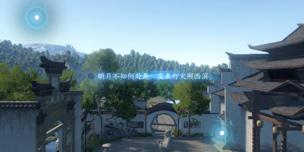1、随游戏镜头移动我们选择中间光点以书院作为意象创作出第一句(四面西山已断肠,当时一纸上书云。)。
