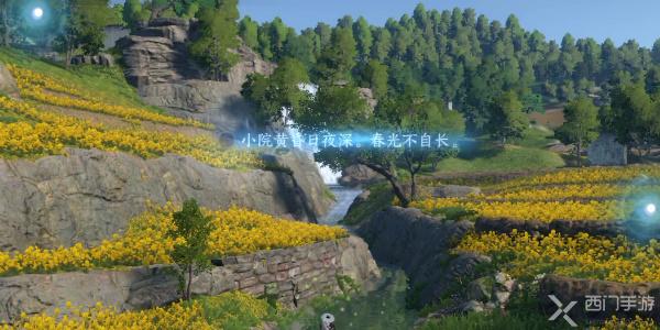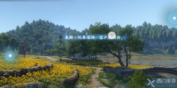1、随游戏镜头往前延伸我们点击中间光点以小院做游意象写出第一句(小院黄昏日夜深,春光不自长。)。