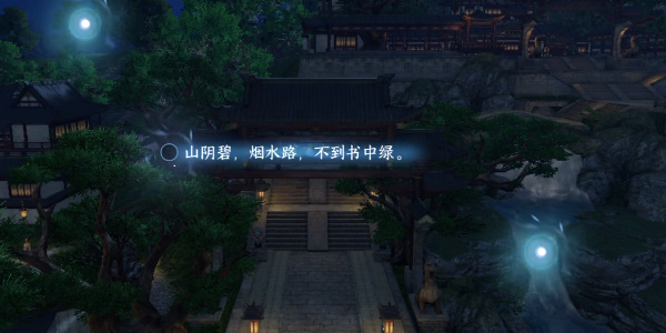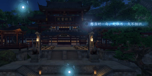 2、视野来到书院内部,玩家要以书院中的回廊为意象作词(回首高楼望处,一川烟水悠瀰)。