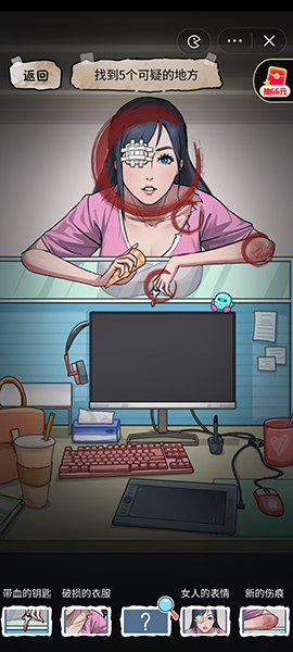 5、之后会出现一个诡异的女孩,玩家要在女同事身上找到带血的钥匙、破损的衣服、眼罩下的红眼、女人的表情、新的伤痕这5个异常。