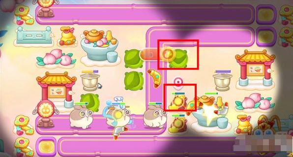 3、打掉桌子之后,锁定上方的栏杆,打掉栏杆之后暂停,在栏杆处放一个回旋镖,之后打钱袋子。