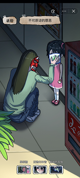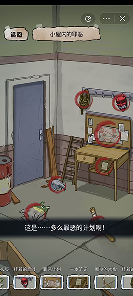 3、之后要尾随人贩子来到小屋,在这里可以找到抽屉里的一本笔记、挂着的面具、破烂的衣服、断掉的木棍、假发,之后左滑桌子上的布,会有罪恶计划,一共6个线索;