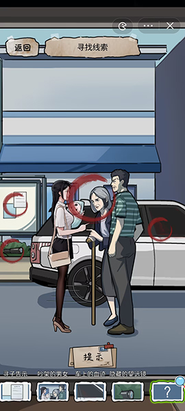 2、之后看完新闻进入第二个场景中,点击三个人中间位置,可以找到吵架的男女,还有左侧告示栏上的寻子告示、车上的血迹、左下角草丛里隐藏的望远镜、***假发这些异常线索;