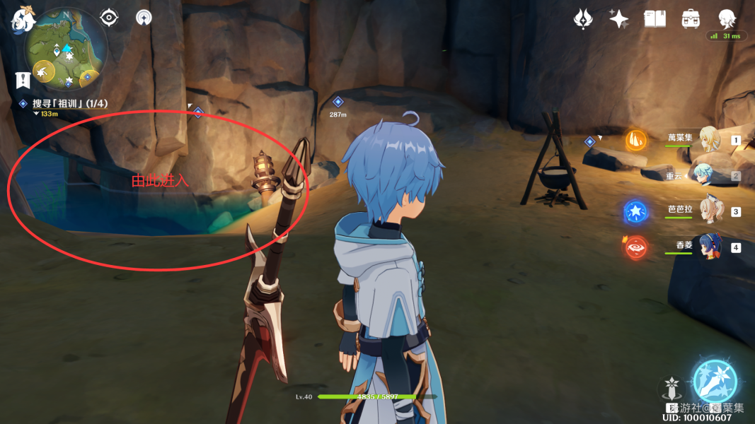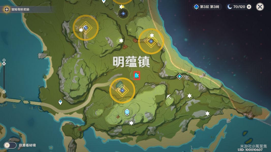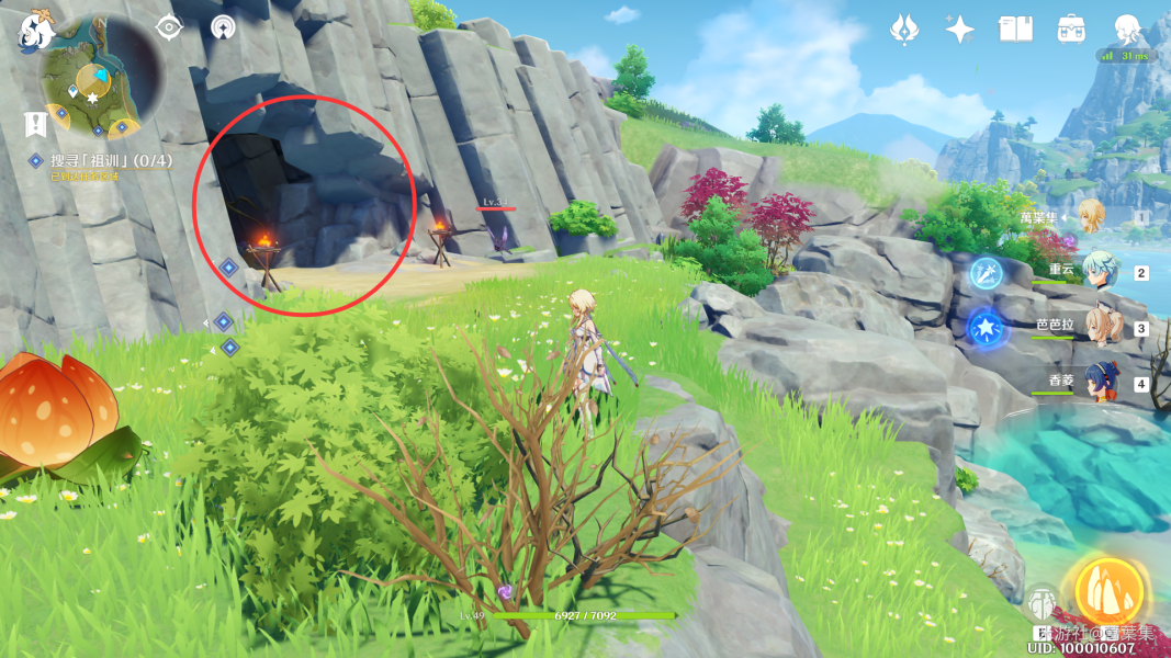 下图的红圈是洞口,有火药桶和一个丘丘人,需要把假墙砸开才能进入,之后就能在矿洞看见箱子。