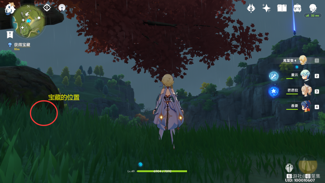 4、收集完4条组训之后,透明老爷子再次出现,任务变更为寻找宝藏,根据他的提示寻找,也可以飞过去,红叶树底下就是宝藏,击败盗宝团之后,就会出现宝藏啦。