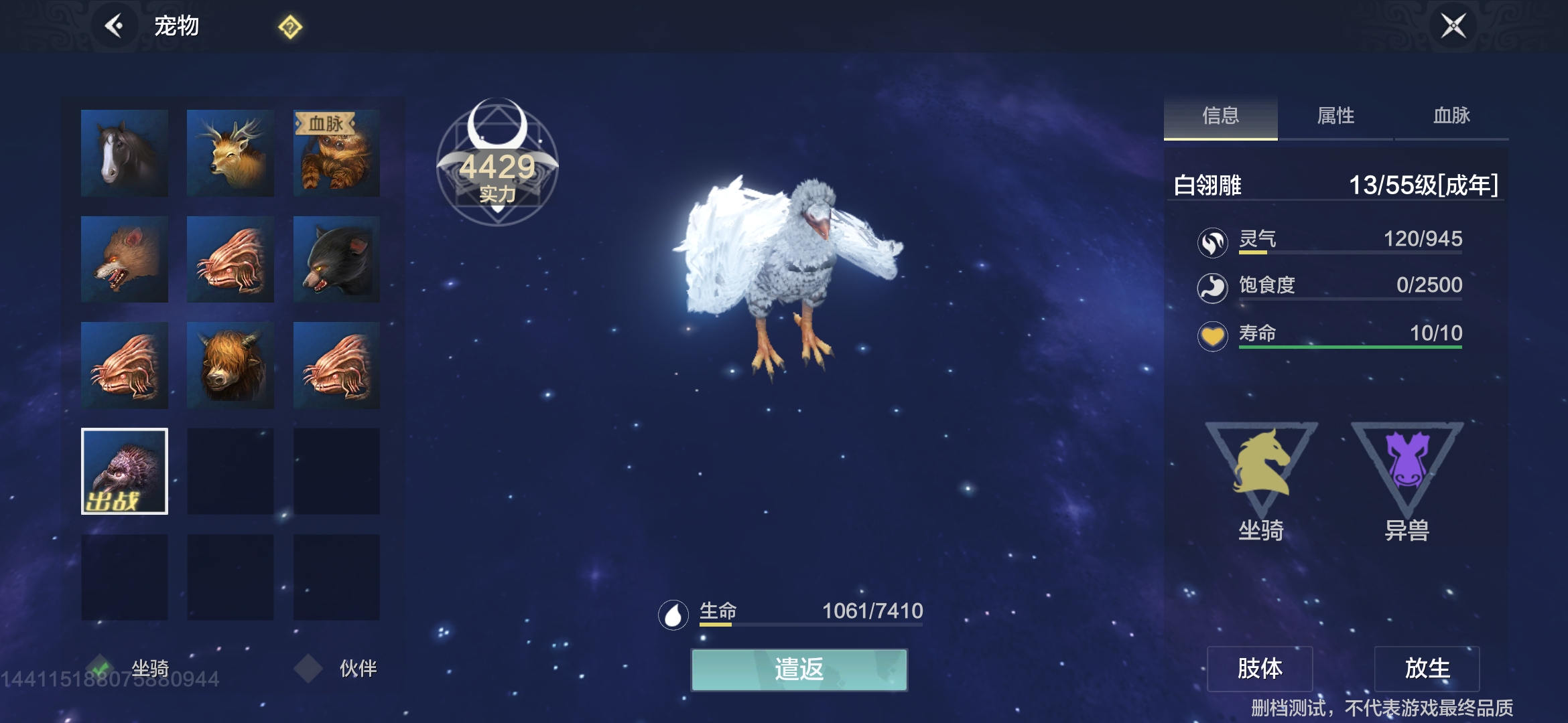 3、白雕和赤翎雕资质差不多,但是白雕更好看,大家可以看喜好捕捉。