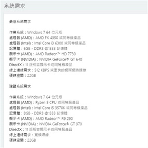 系统:Windows 7(游戏仅支持64位)、CPU:Intel Core i3 6300 / AMD FX 4350、内存:6GB、硬盘:22GB、显卡:NVIDIA GeForce GT 640 / AMD Radeon HD 7730、DX:DirectX 11.0