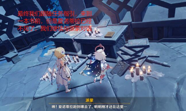 2、继续前进直到跟随任务指引来到一本书前但是夏诺蒂拉已经不见了继续与派蒙对话。