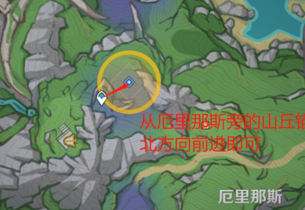 4、玩家从如图所示的锚点向东南方向前往山坡,到图中的位置可以看到一个山洞击败魔物打开宝箱就能获得第三个书页。