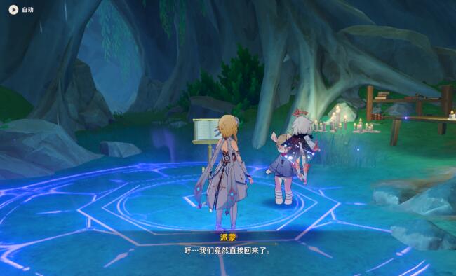 4、玩家传送过去后夏诺蒂拉又不见了,需要击败冒出的魔物,与派蒙完成对话,继续向前探索。