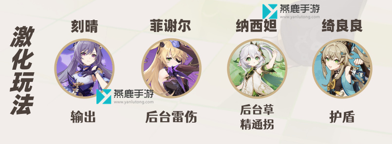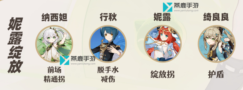 分析:搭配该队伍时可选择全堆生命的玩法,全力提高队伍的生存。当绮良良解锁4命,队伍对单时可以考虑“单草+风元素减抗”的搭配。