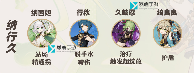 分析:“纳行久”第四人选择较为灵活。绮良良自身护盾量可观,加入队伍能够提高容错率。而在提供护盾的绮良良加入后,可以将久岐忍多堆叠精通,提高久岐忍触发的超绽放伤害。