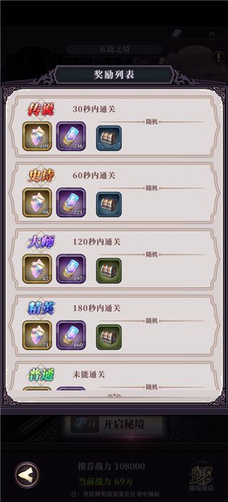 当然你的阵容越厉害,通过时间越短奖励越丰富,这边会有等级设定,主要分为:普通-精英-大师-史诗-传说。具体奖励如下: