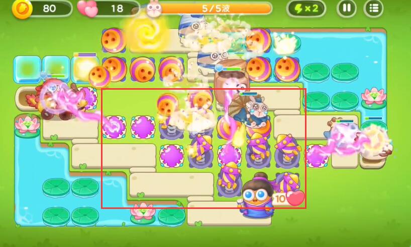 6、中间的炮塔摆放的差不多的时候可以向荷塘进行摆放。