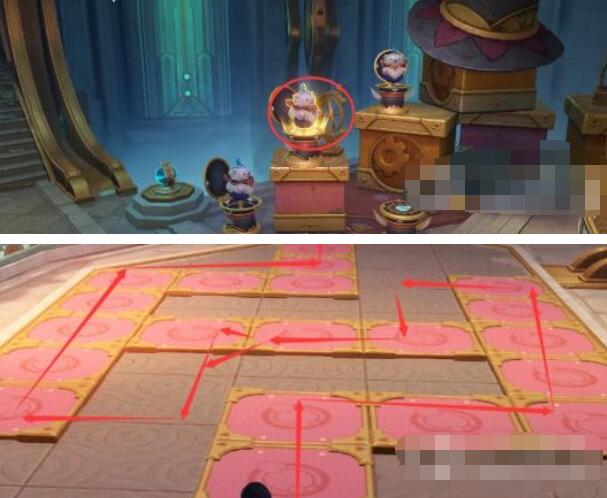 4、乘坐电梯上行固定移动状态下金色标记的木偶进入到一个密道中,完成魔术解谜,按照下图的方法就可以通过。
