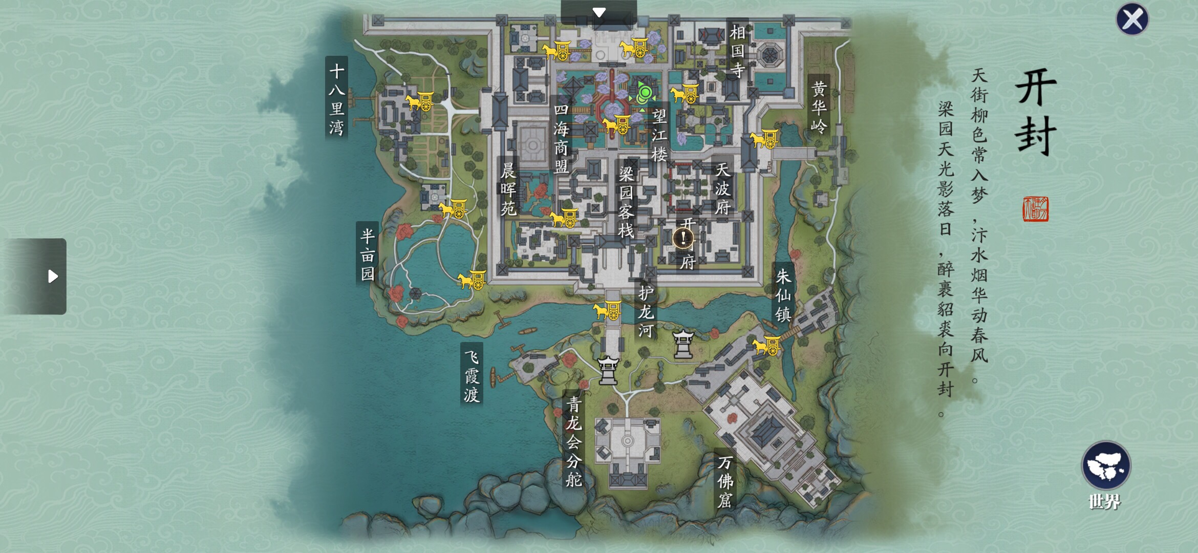 茶童在开封城内望江楼的左上角,具体坐标(603,873)