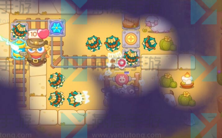 6、在轨道的右边还有几个石头,使用弓箭将其打掉之后放上弓箭。