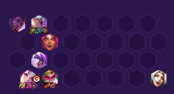 锐雯和俩个输出位站到同一边的前边,然后将金克斯放到另一边吸引对面刺客,剩下的棋子只需要将两个输出保护起来就行了。
